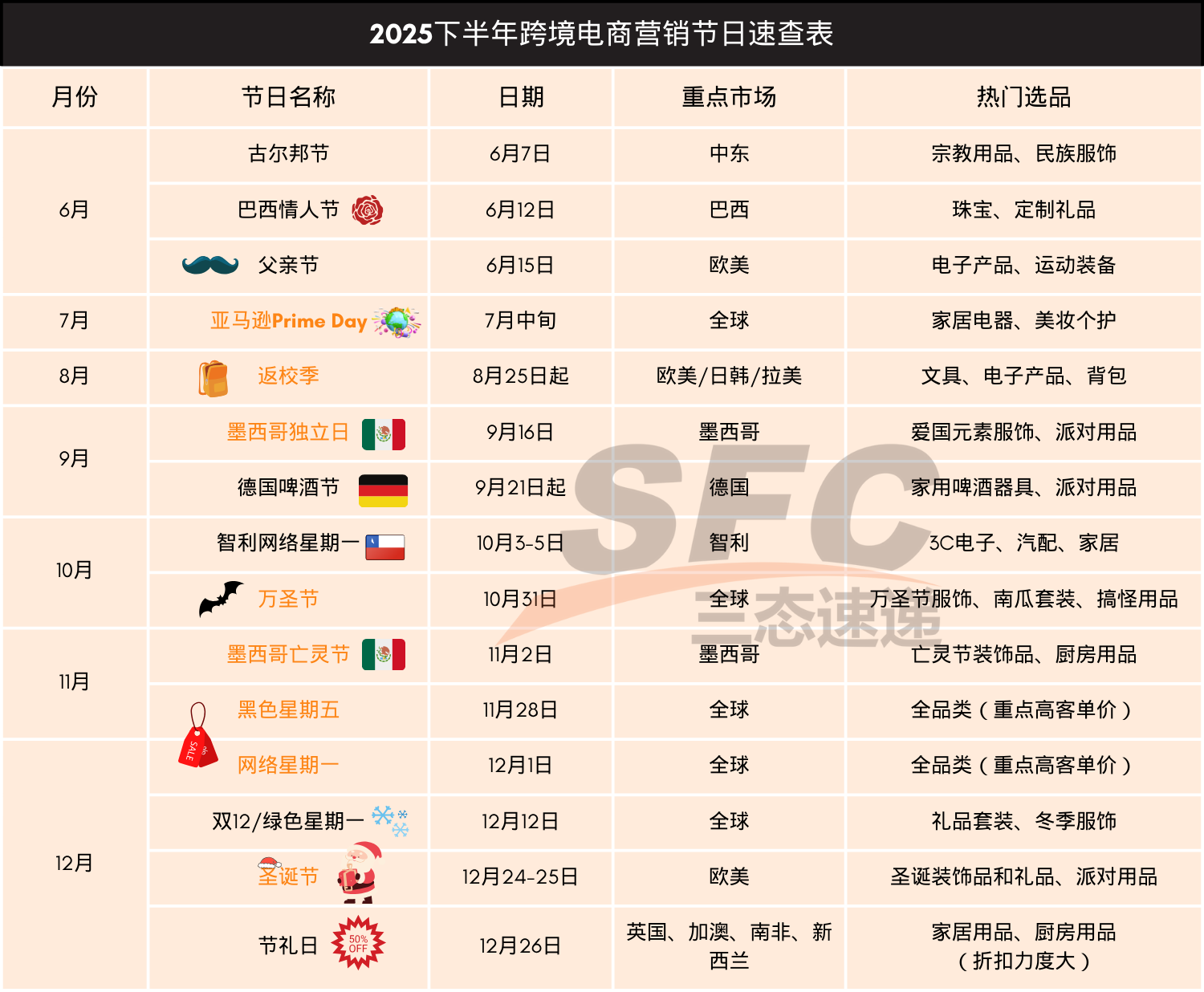 閱讀本文,三態(tài)速遞(SFC)整理2025年6-12月關(guān)鍵海外節(jié)日與平臺(tái)大促活動(dòng)時(shí)間,旨在幫助跨境賣(mài)家精準(zhǔn)卡位流量爆發(fā)點(diǎn),為旺季做好營(yíng)銷(xiāo)準(zhǔn)備!